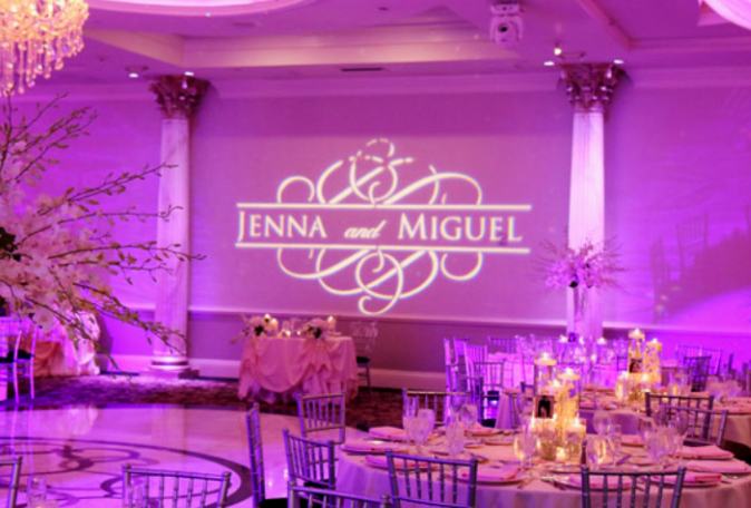 Highlight your name in Lights! Our custom monogram projects your name/occasion on the wall, dance floor, ceiling, etc. Common phrases include “Congrats Mr. & Mrs. Smith” or “Sandra’s Sweet 16” along with fun designs. Ask for our catalogue for hundreds of options.