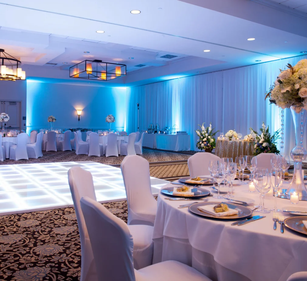 Turn the venue’s boring & harsh white lights off and create a beautiful, ambient up-lit room. This upgrade strategically places lights around the venue & turns your room into something elegant, romantic, & unforgettable. Choose from 32 different colors.